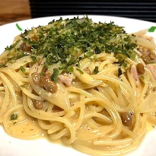 また、お腹を満たしたい方にぜひ召し上がっていただきたいのが、当店名物の「納豆カルボナーラ」です。