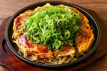 熟練の技で仕上げられるお好み焼きは、香ばしく焼き上げられた麺と、